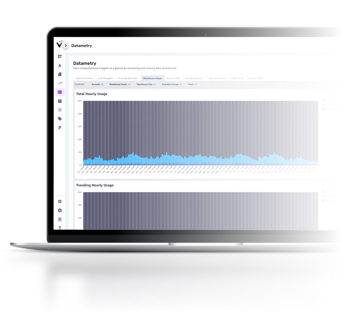 Vega Datametry views are organized in a recognizable manner to users of the larger Vega Platform and builds on it by providing a more granular level of control for data professionals. It allows users to see a deeper level of spend with data-specific terms (Database, Warehouse, User).